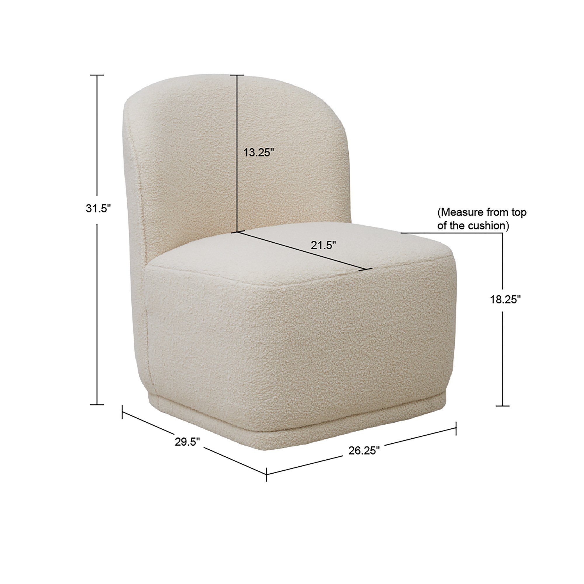 DESCRIPTIONThe Madison Park Irene Armless Swivel Chair offers a modern sophisticated update to your living room. Upholstered in an ivory faux boucle fabric, this swivel chair flaunts a rounded design and curved back to create a chic minimalistic profile. The hidden swivel base allows the chair to fully rotate 360 degrees. Perfect for small spaces, this swivel chair brings an inviting look and cozy comfort to your home decor. Ready right out of the box! No assembly is required.PRODUCT DETAILSSee below1 Swivel Chair: 26.25"W x 29.5"D x 31.5"HSeat Dimension: 26.25"W x 21.5"D x 18.25"HSeat Cushion Thickness: 15.5"Legs Height: 20"Back Rest Size: 26.25"W x 13.25"HMaximum Weight Capacity: 300 lbsMATERIALFrame Composition: solid wood and plywoodLeg Material: Metal baseFabrication Composition: 100% polyesterFilling: FoarmMetal Finish: Black