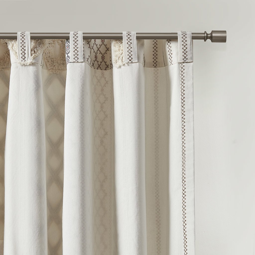 DescriptionThe INK+IVY Imani Cotton Printed Window Panel with Chenille Stripe and Lining offers a chic and casual update to your home. This ivory window panel features a geometric print with a tufted chenille stripe trim, for a textured artisanal look and feel. A lightweight white cotton lining on the reverse softly filters light, while providing better drapability and added privacy. In addtition, this 100% cotton curtain panel is also OEKO-TEX certified, meaning it does not contain any harmful substances or chemicals for the best in quality comfort and wellness. Each panel is finished with a rod pocket top for easy hanging, and back tabs for a more clean and tailored finish. This window panel is sold as a single and 2 window panels must be purchased to cover any standard size window. Complete the look with coordinating bedding sets and bath decor, available and sold separately.Product Details50x84"1 Window Panel:50"W x 84"LMaterial100% cotton, printed and tufted with chenille, with cotton lining on the back. Finished with rod pockets and back tabs; fits up to 1.25 inches diameter rod.
