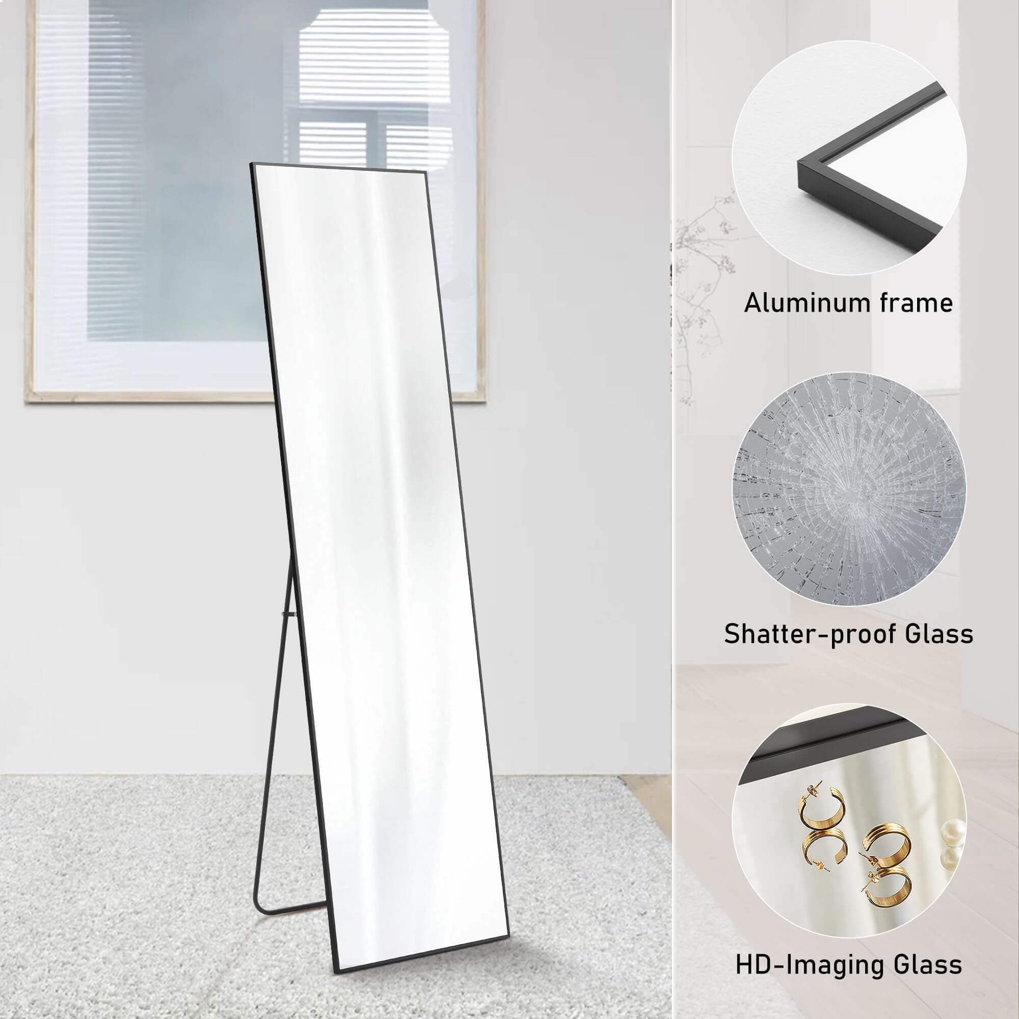 Floor Standing Mirror, Wall Mirror with Stand Aluminum Alloy Thin Frame,16''*59'',Black-rect
