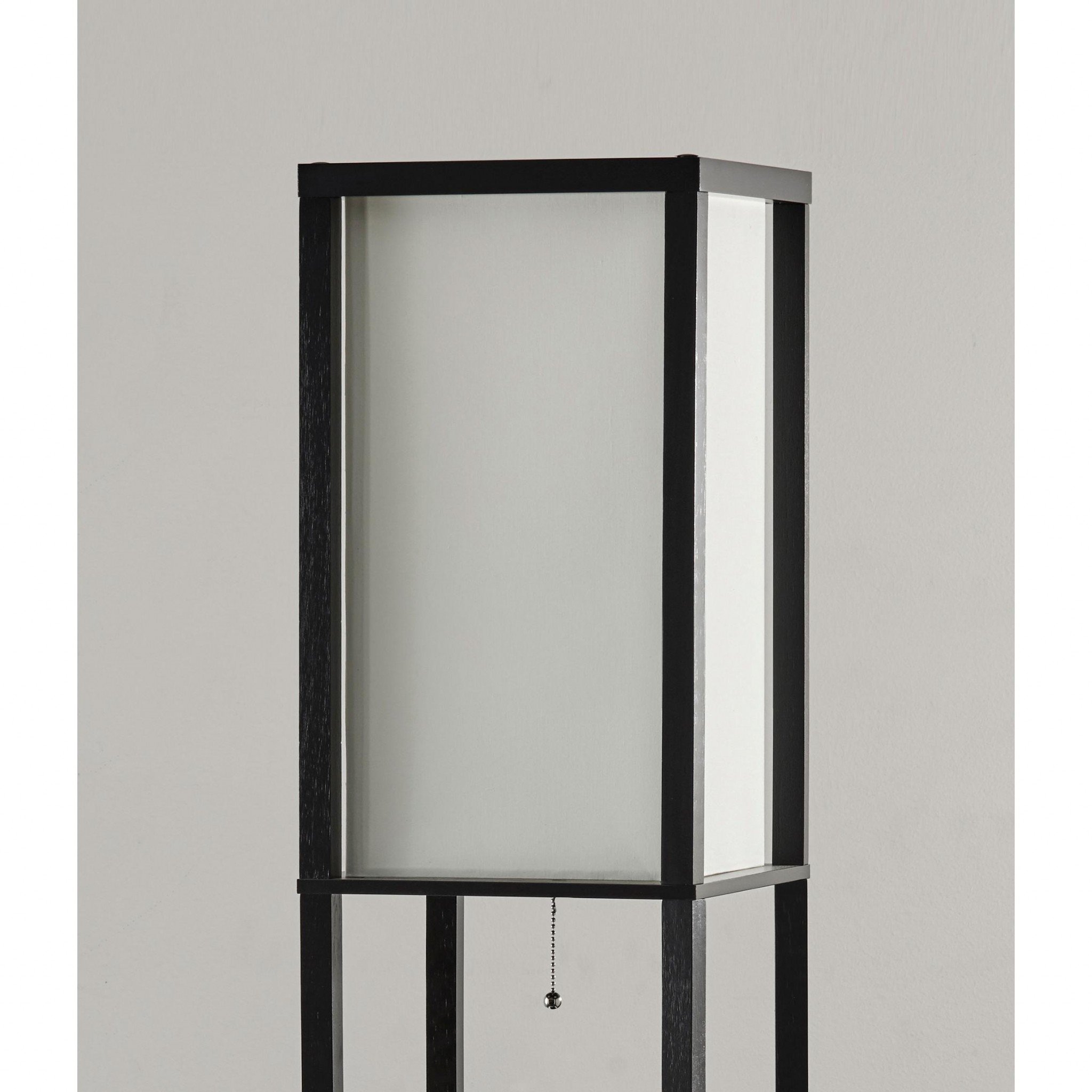 Standing an impressive 72" H, The Black Sleek Column Style Floor Lamp is just the streamlined and functional design that your contemporary decor has been looking for. The black wood finish of the open box frame supports two horizontal shelves and a base that make it perfect for display and storing. Ideal for photos, books, and decorative accents, these shelves make this a piece of furniture rather than just a lamp and would look great in living room, home office, family room, bedroom, or office setting. The standard silver ball pull-chain switch controls the light from the on and off settings and is accented with a collapsible square creamy ivory/off white polyester blend fabric shade. This lamp has a clear cord and is smart outlet compatible. Bulb is not included.