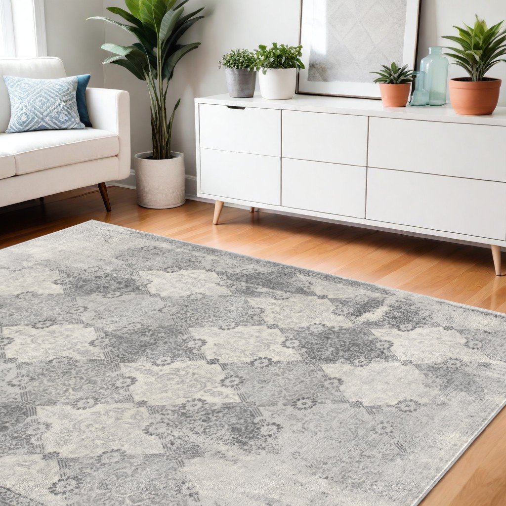 Introduce a timeless element into your living space with this Gray Distressed Trellis Pattern Area Rug that combines the on-trend hues of the modern era with the traditional patterns. Brimming with intricate details in shades of gray to emphasize the traces of distressed trellis patterns for visual interest. The dense pile gives a luxurious underfoot that feels super soft and cozy on the touch. Ideal for indoor usage, this rug is made in Turkey with premium quality polypropylene that is not only durable and stain-resistant but also easy to maintain. The cool-toned hues of this area rug will induce a calm and comforting ambiance into your place while blending in with a range of modern interior decors. 66” x 45” x 0.4”