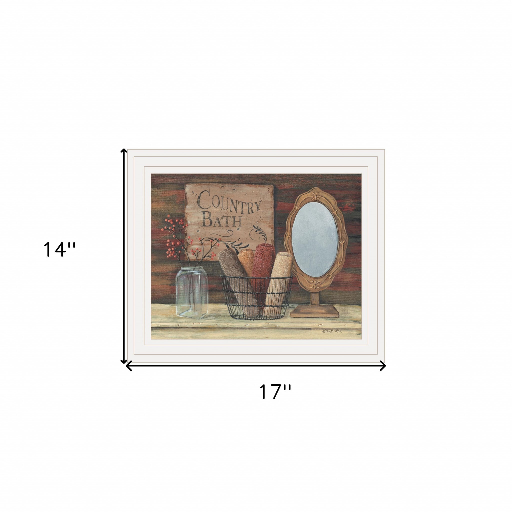 Bring some sizzle to your space with this eye-catching country bath 6 white framed print bathroom wall art. This print is a visual artistic expression that allows you to decorate your space in style. Reproduced for you on paper, this hanging decorative accent will be a trendy and fashionable way to dress your walls. Adding this hanging wall art to your space to make your room feel more finished and attractive. Utilize this opportunity to create a focal point in the room with this fabulous wall decor option. 14-inch H x 17-inch W x 1-inch D