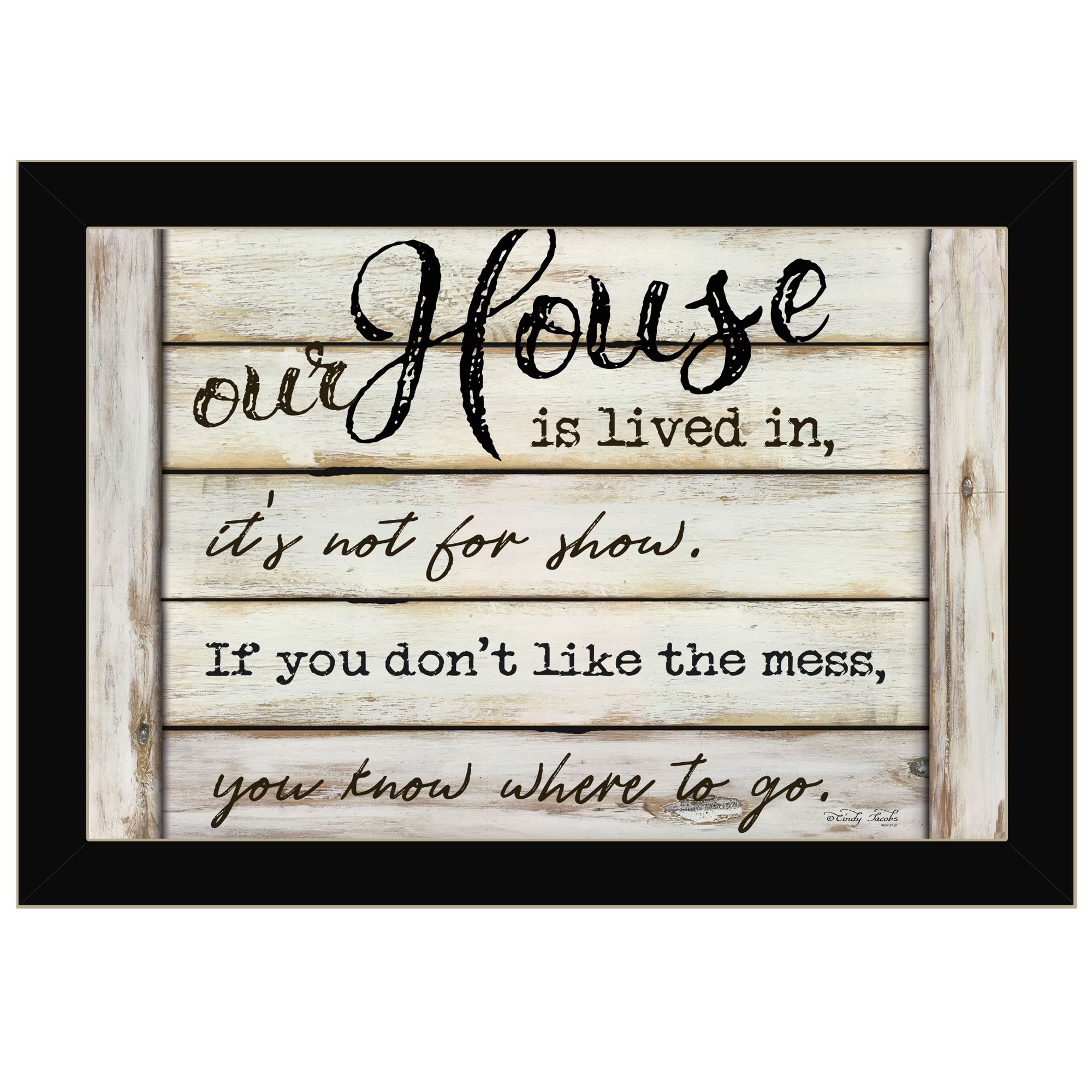 Unique and decorative, this our house is lived in 1 black framed print wall art will leave a lasting impression. This print is a visual artistic expression that allows you to decorate your space in style. Reproduced for you on paper, this hanging decorative accent will be a trendy and fashionable way to dress your walls. Hang on your wall to add some up to date fashion and decoration. Utilize this opportunity to create a focal point in the room with this fabulous wall decor option. 14-inch H x 20-inch W x 1-inch D