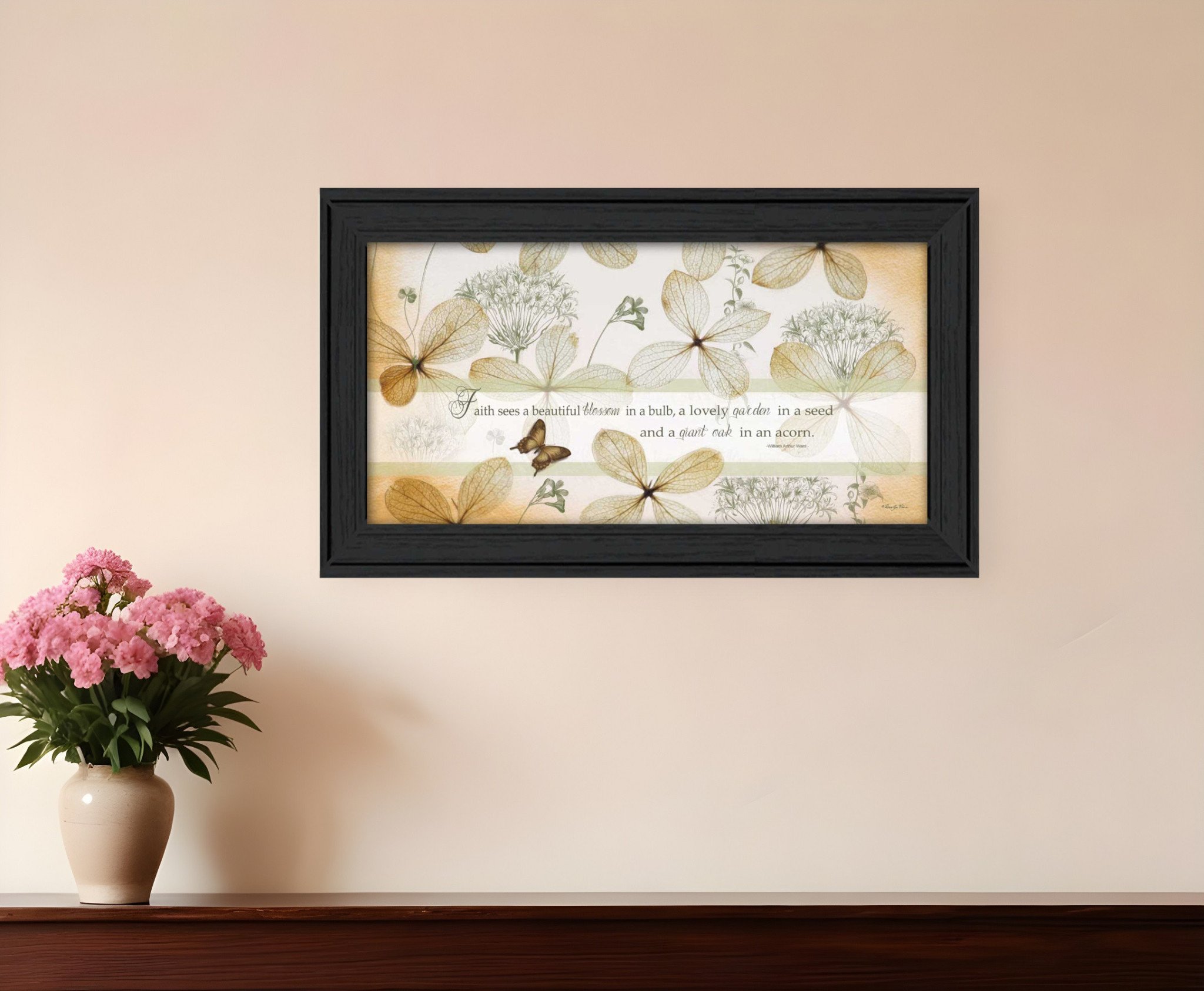 Unique and decorative, this faith sees black framed print wall art will leave a lasting impression. This print is a visual artistic expression that allows you to decorate your space in style. Reproduced for you on paper, this hanging decorative accent will be a trendy and fashionable way to dress your walls. Adding this hanging wall art to your space to make your room feel more finished and attractive. Utilize this opportunity to create a focal point in the room with this fabulous wall decor option. 12-inch H x 21-inch W x 1-inch D