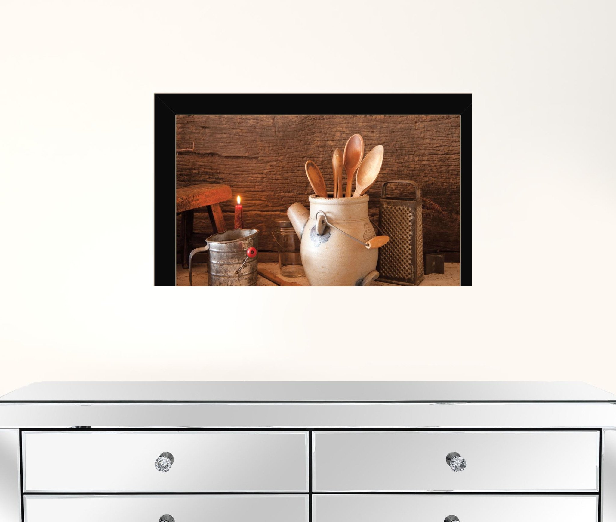 This grandmas kitchen tools 1 black framed print kitchen wall art will add a beautiful decorative accent to your decor. This print is a visual artistic expression that allows you to decorate your space in style. Reproduced for you on paper, this hanging decorative accent will be a trendy and fashionable way to dress your walls. Adding this hanging wall art to your space to make your room feel more finished and attractive. Instantly liven up your space with this art that brings color and dimension to your walls. 14-inch H x 20-inch W x 1-inch D