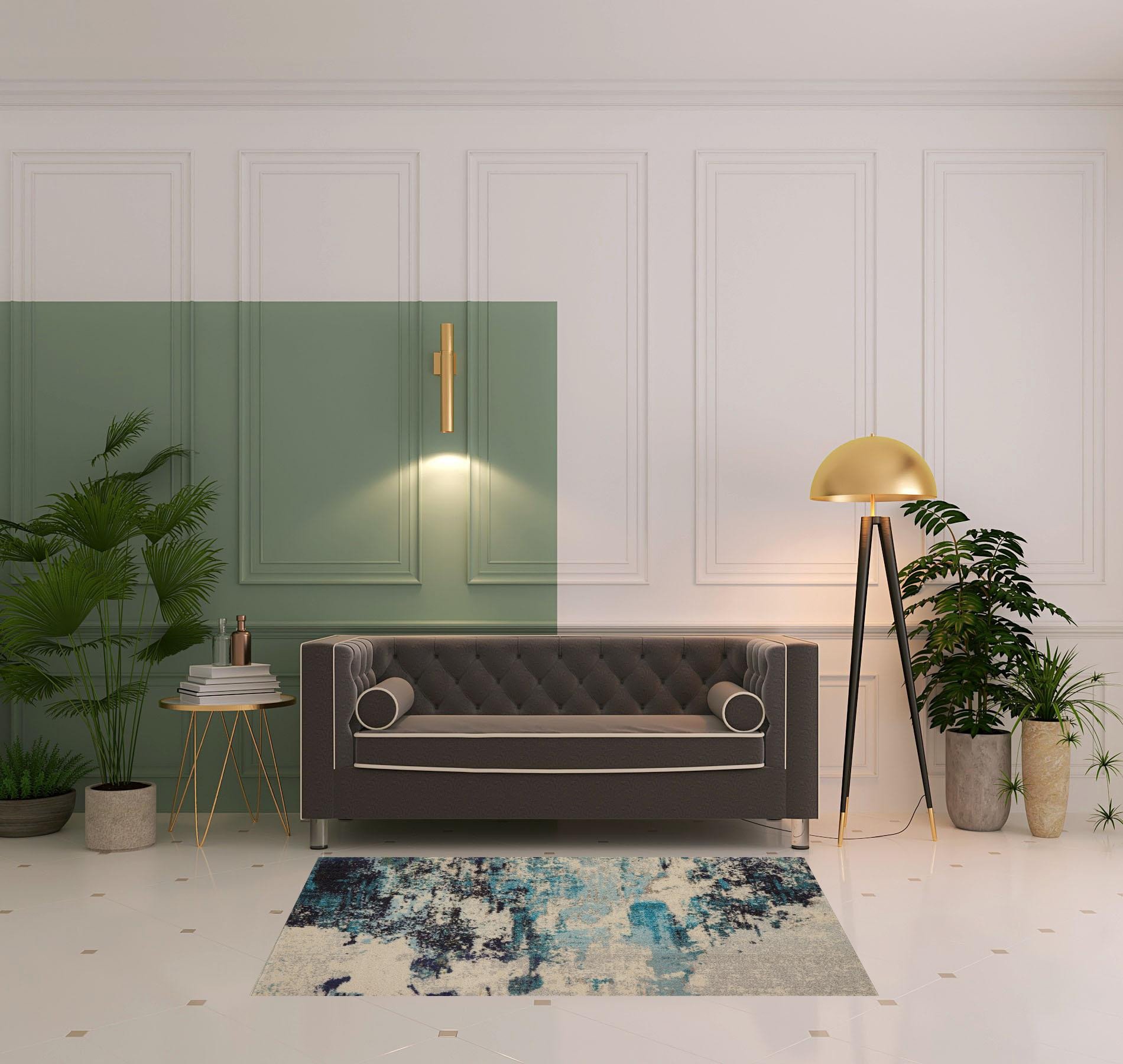 Add some artistry to your room with this 4' x 6' ivory and teal blue abstract power loom non skid area rug. This rectangle shaped rug features a abstract design in ivory and teal blue to give it visual interest. A classic shape marries with good looking design for your space This superior Turkish rug represents the highest quality and is built to last. Place this area rug against a hardwood or tile floor and it will enliven your living space with style and sophistication. .50" H x 47" W x 71" D