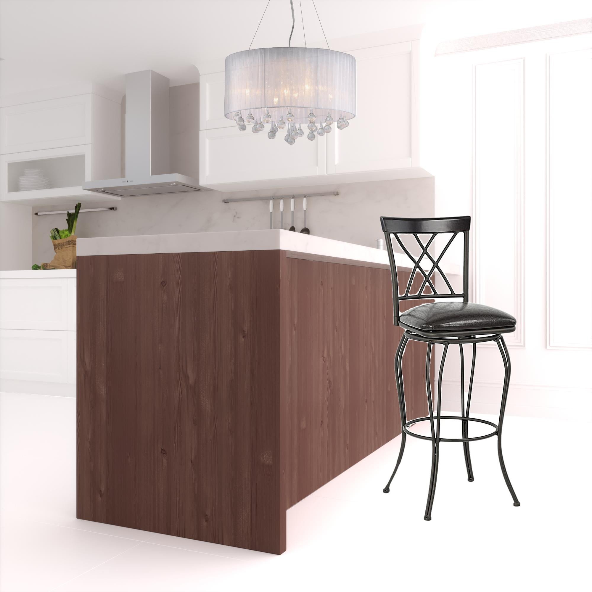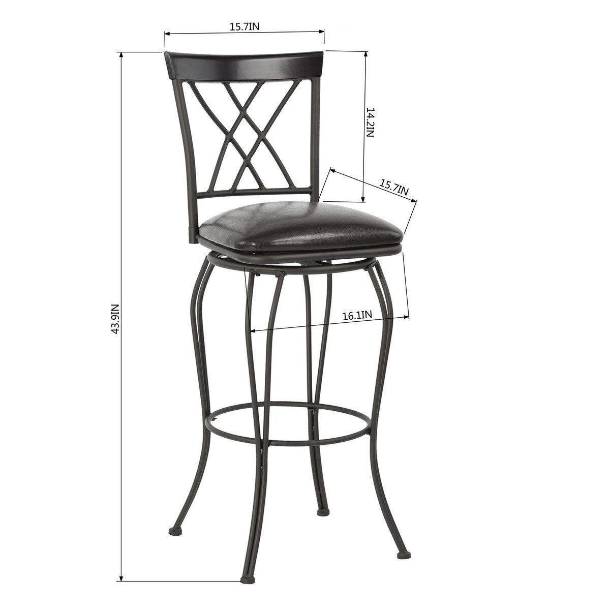 With this set of two 44" black faux leather cross back bar height bar chairs you can add design and extra seating to your space. The black coloration runs throughout this good looking steel and faux leather stool. Not only good looking and stylish, this chair features a round shaped seat and a full decorative back for the ultimate in comfort and enjoyment. This stool will look great in your dining room, kitchen, bar, or recreation room. 43.9" H x 16.34" W x 21.26" D