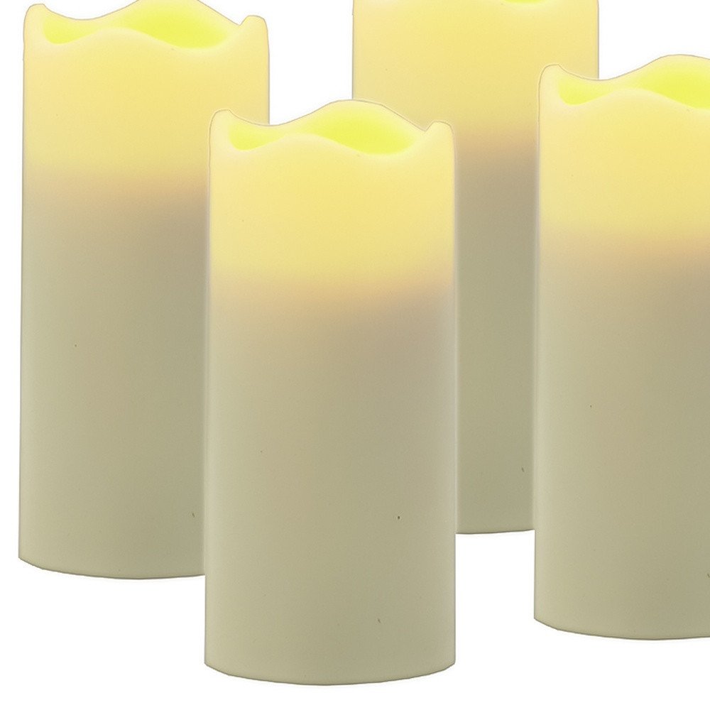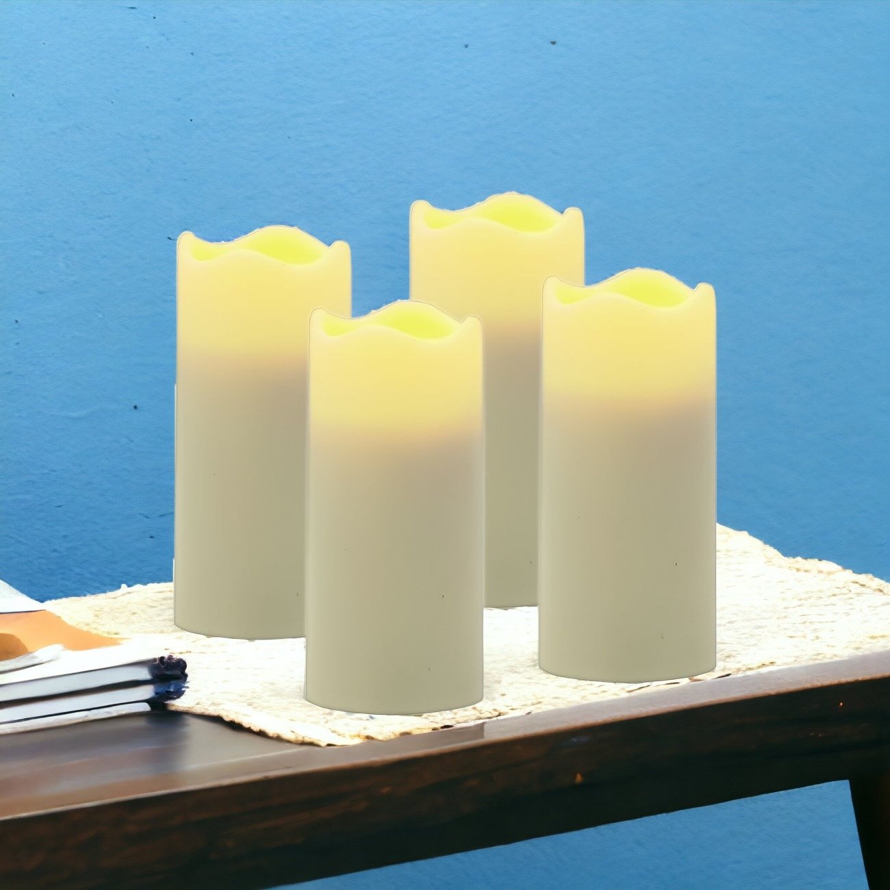 Transform your space with the radiance of this set of four ivory flameless pillar candles. The classic, cylindrical shape makes this pillar candle a versatile addition to any decor style, whether it's traditional, contemporary, or modern. Pure beeswax candles are completely natural and free from harmful toxins. The flickering feature is designed to create an authentic candlelight experience. Let the warm glow of candlelight create an intimate and welcoming ambiance for your guests or a soothing atmosphere for yourself. 3-inch H x 1-inch W x 1-inch D