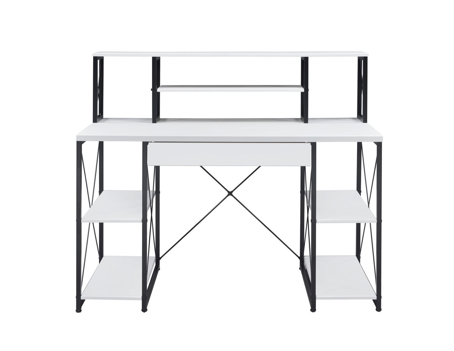 This 47-inch white and black computer desk will help to turn your office space into an executive suite. Designed to easily fit into most spaces, this classically shaped rectangular desk will turn your room into a productive workspace. Made for the ultimate in convenience and versatility, this desk can be assembled in either direction. A single drawer gives this desk some hidden storage for your office essentials. Forged with premium craftsmanship and design, this desk is built to last. 41-inch H x 47-inch W x 24-inch D