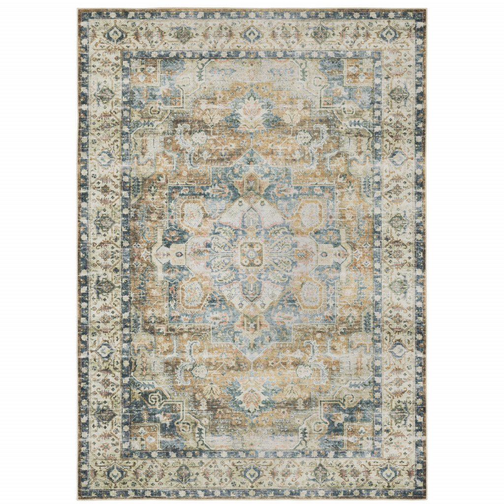 Add great coloration and comfortable texture to your space with this 2' x 3' blue gold brown green and salmon oriental printed stain resistant non skid area rug. This rectangle shaped rug features a oriental design in blue gold brown green and salmon to give it visual interest. A classic shape marries with good looking design for your space Ideal for spaces with kids and pets, this rug is stain resistant to help repel stains and spilled liquids. Place this area rug against a hardwood or tile floor and it will enliven your living space with style and sophistication. 0.12" H x 24.02" W x 35.83" D