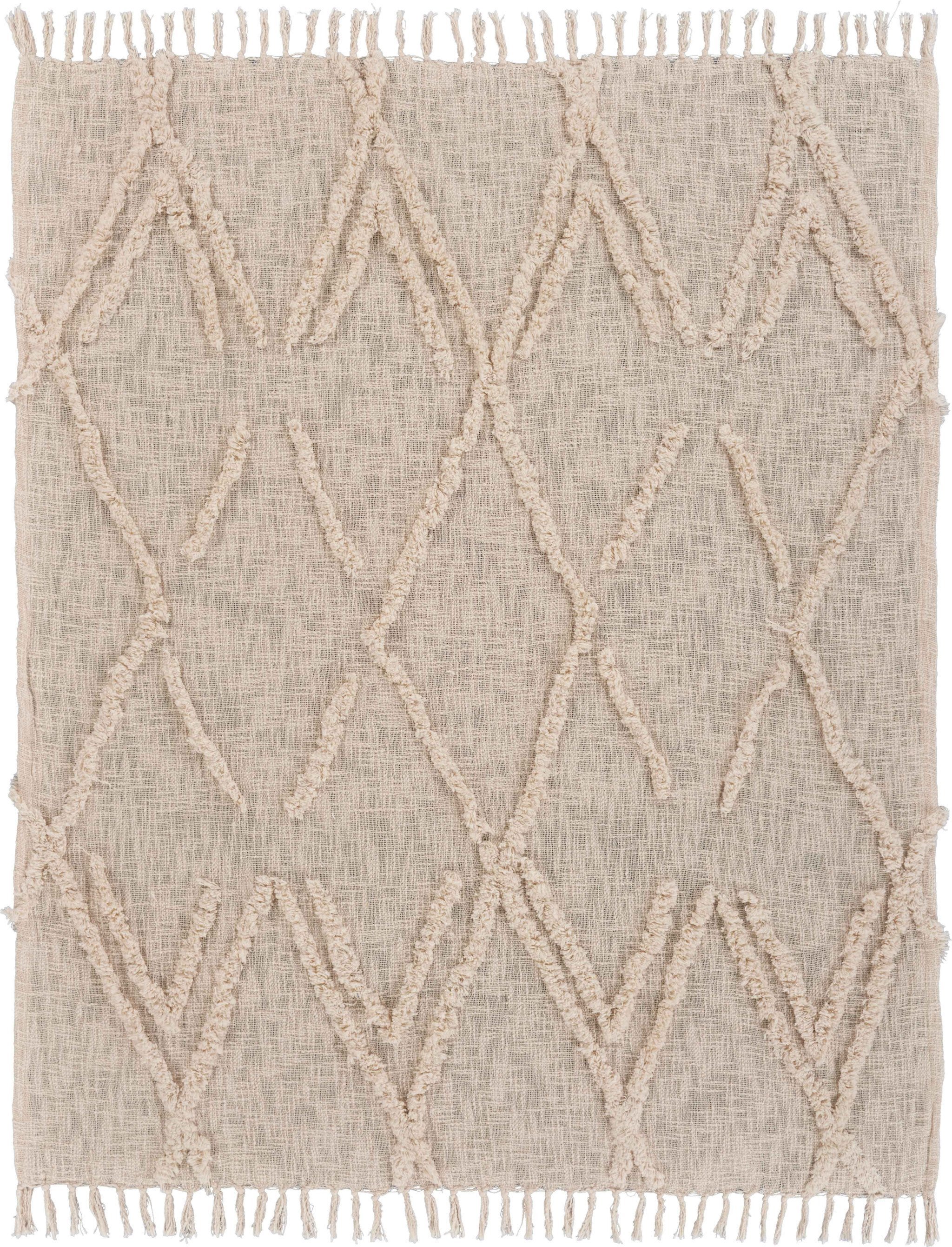 60" X 50" Beige Woven Cotton Geometric Throw Blanket with Fringe